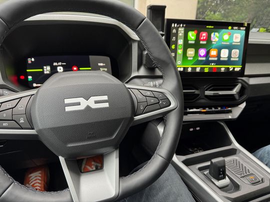 Bigster użyczony przez Tandem Będzin jest wersji hybrydowej o mocy 155 KM. Pierwsze wrażenie jest nieco inne, niż cytowany opis. Bigster z zewnątrz wygląda klasycznie, wręcz dostojnie. Linie zwłaszcza przodu poprowadzone są ostro, co daje poczucie mocy i bezpieczeństwa. Zwłaszcza z pozycji kierowy i przedniego pasażera widać charakterystyczne boczne podwyższenia maski silnika. Wygląda to ładnie. Powoli odkrywamy nową stylistykę i wyposażenie Dacii. Ciekawe wloty powietrza. Skrzynia biegów oczywiście automatyczna, sterowana malutką dzwigienką na tunelu środkowym, czyli klasycznie. Zaznaczamy to ponieważ coraz częściej dzwigienka, czy przełącznik biegów (dziś trudno to nazwać „dźwignią zmiany biegów”) ląduje przy kierownicy.