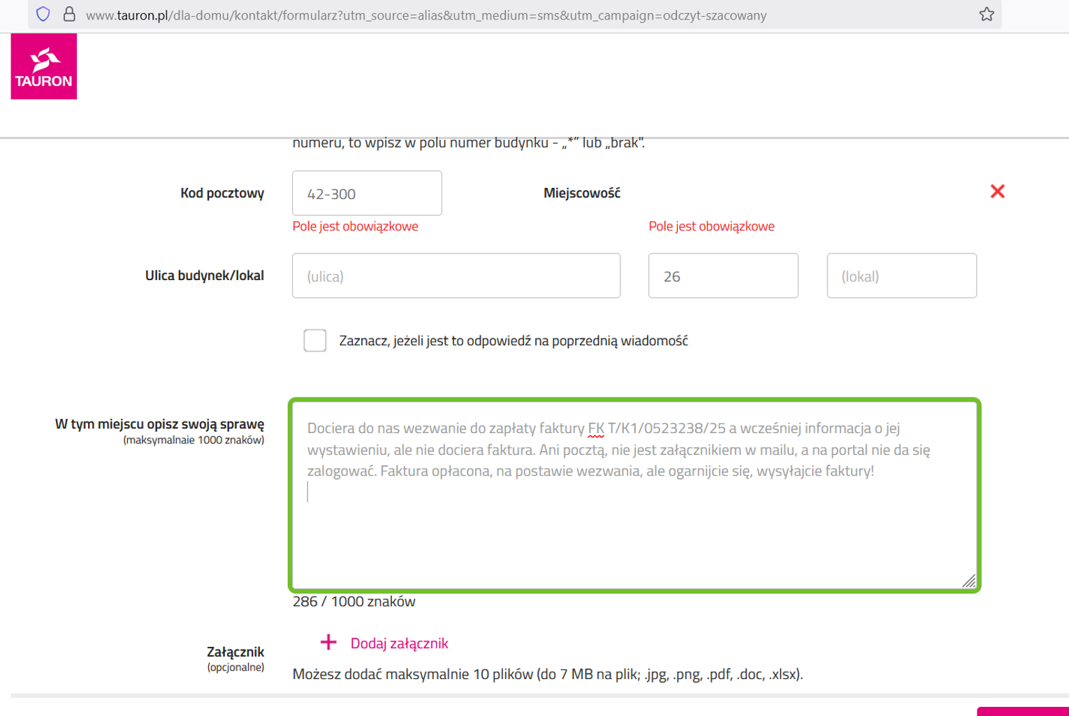 I podsyła treść wiadomości do Tauron Sprzedaż, której nie da się wysłać: „Dociera do nas wezwanie do zapłaty faktury FK T/K1/0523238/25 a wcześniej informacja o jej wystawieniu, ale nie dociera faktura. Ani pocztą, nie jest załącznikiem w mailu, a na portal nie da się zalogować. Faktura opłacona, na postawie wezwania, ale ogarnijcie się, wysyłajcie faktury!”