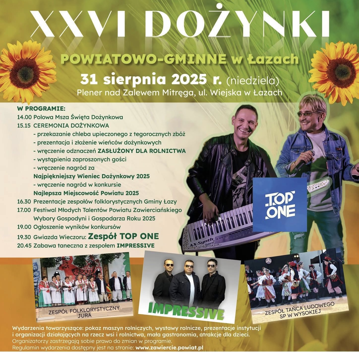 Szczegóły wydarzenia na plakacie, i można by właściwie nic nie pisać, gdyż scenariusze dożynek są co rok niemal takie same: msza, przekazanie chleba z nowej mąki, prezentacja wieńców dożynkowych, przemówienia. W powiecie zawierciańskim dochodzi ogłoszenie wyników konkursu: Najlepsza Miejscowość Powiatu 2025. Od mszy wszystko zaczyna się o 14:00, ceremonie (przemówienia) od 15:15. O 19:30 wystąpi zespół TOP ONE.