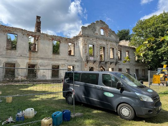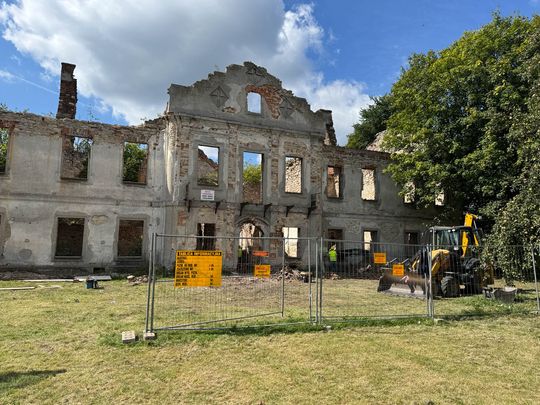 Za kwotę 500.000 zł gmina oczywiście nie odbuduje pałacu, ale ruina zostanie zabezpieczona, tak aby można było do pałacu bezpiecznie wchodzić urządzać w nim np. wystawy czy przedstawienia. Zostanie uporządkowany teren, usunięte wszystkie rosnące na murach drzewa i krzewy, które dodatkowo niszczą mury. Już teraz można z daleka (teren budowy!) zobaczyć, że prace ruszyły a ruiny pałacu powoli odsłaniają się z krzaków.