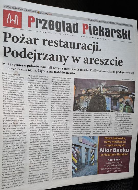 Jest w artykule Przeglądu Piekarskiego zastanawiający fragment. Gazeta cytuje profil fb „Hotel Restauracja Imperium”, wpis z 20 maja 2025: „przyczyną pożaru było celowe i świadome podpalenie! Z zapisu rejestratora monitoringu udało się odzyskać nagranie i całość zdarzenia”.