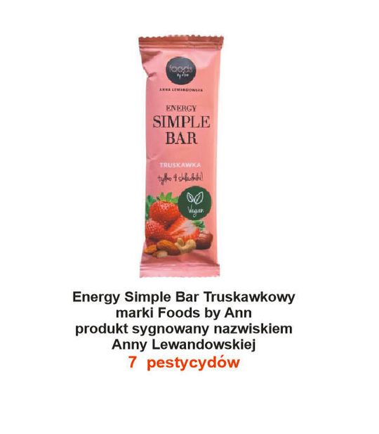 Niewiele lepiej wypadł baton Energy Simple Bar Truskawkowy marki Foods by Ann Anny Lewandowskiej. W batoniku przeznaczonym dla dorosłych i dla dzieci wykryto siedem różnych pestycydów.
