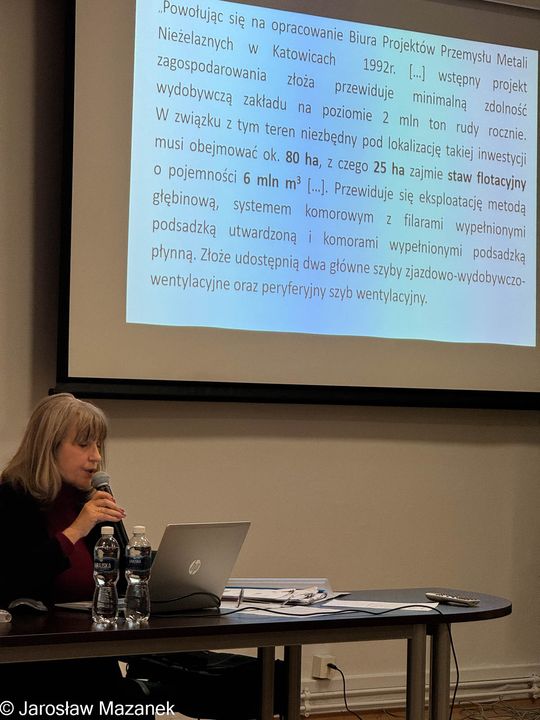 Profesor Mariusz Czop odniósł się do materiałów rozprowadzanych po okolicznych gminach przez Starostwo Powiatowe w Myszkowie, które sugerują, że eksploatacja złoża niesie zagrożenie dla rzeki Warty (zrzut wód kopalnianych), a ewentualna kopalnia wymagałaby około 80 hektarów terenu na tzw. „staw poflotacyjny” (miejsce gdzie składowany jest szlam z rozdrobnienia skały). Odpowiadał też na pytania o powody wykonania nowych odwiertów, skoro są stare badania: