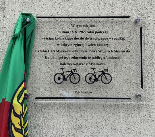 Zbliżała się już 60 rocznica zapomnianej tragedii, gdy świadek tego wypadku, również w młodości kolarz LZS Myszków Tadeusz Garncarz wspomniał zdarzenie swojemu synowi Romanowi Garcarzowi (też zawodnik kolarski przez część życia). Z kolei pan Tadeusz Garncarz dzisiaj odnosi sukcesy jako kolarski senior. Z z rozmowy ojca z synem zrodził się pomysł upamiętnienia wypadku z 16 X 1965 roku poprzez umieszczenie tablicy pamiątkowej. Ta została za zgodą właściciela budynku umieszczona a uroczyście odsłonięta 9 X 2025 roku. Tablica zawisła na budynku apteki przy ulicy Kościuszki. Miejsce historyczne znane też jako siedziba LOK, gdzie uprawnienia do prawa jazdy zdobywały pokolenia kierowców.