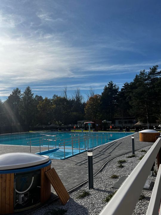 A może znajdą się chętni na wynajem domków? Dwa niewielkie, weekendowe domki stanęły tuż obok nowowybudowanych basenów. Znajduje się w nich wszystko co potrzeba – sypialnia, aneks z kuchnią oraz łazienka – idealne na kilkudniowy odpoczynek na łonie ogrodzienieckiej natury.