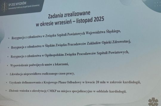 Jak kąpiel w lodowanej wodzie była prezentacja dyrektor SP ZOZ Aldony Sylwa i jej doradcy Dariusza Jorga jakiej wysłuchali radni Rady Powiatu w Myszkowie 26 listopada. W wielkim skrócie można tę prezentację streścić tak: „niegospodarność, lewe umowy, fałszowanie bilansu szpitala, żeby nie wyglądał tak tragicznie jak jest w rzeczywistości. Ale zdobyliśmy 20 mln zł na kardiologię, pisząc po nocach nowy wniosek.” Tu warto uchylić nieco informacji, jakie zdobyliśmy, a nie usłyszeli ich radni. Poprzedni dyrektor Krzysztof Bestwina faktycznie zanim odszedł żegnany w niesławie, ale przez radnych PiS kwiatami, złożył wniosek w tym projekcie w którym nabór został ogłoszony 29 lipca, ale tylko na 4 mln zł i na zakup angiografu, który w szpitalu jest. Należy co prawda do podwykonawcy, firmy Carint, ale to sprzęt nowy, bardzo dobrej jakości. Było więc niemal pewne, że wniosek SP ZOZ o dotację byłby odrzucony. Nie dowiemy się tego, ponieważ nowa dyrektor Aldona Sylwia wniosek wycofała i złożyła nowy; na 20 mln zł przeznaczone na kompleksowy remont oddziału, wyposażenie zwiększenie zakresu usług.