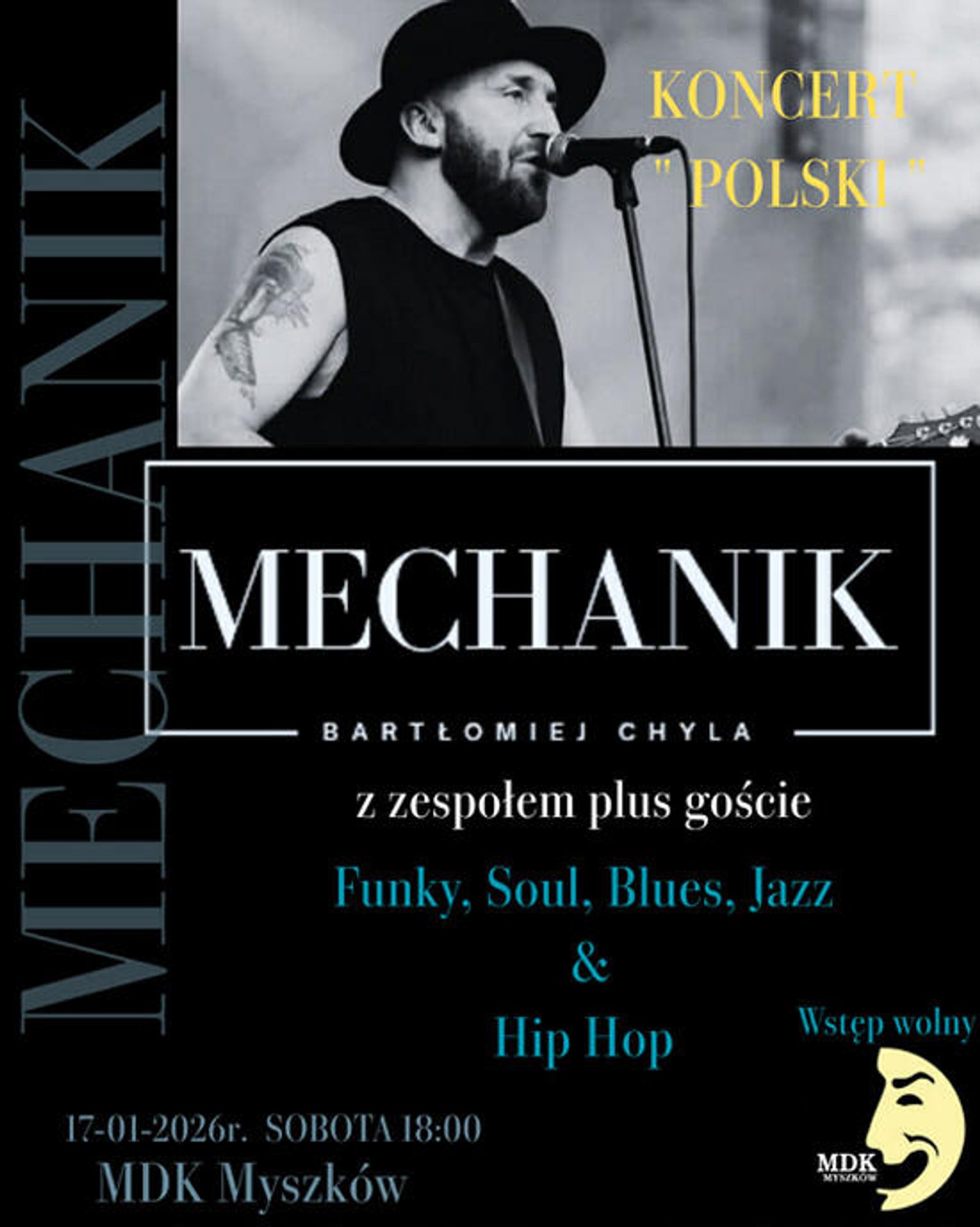 17 stycznia 2026r. o godz. 18.00 Miejskim Domu Kultury w Myszkowie odbędzie się koncert „Mechanika" ( Bartłomieja Chyli ): wraz z zespołem będziemy promować nową Epke "Polski", podczas koncertu zagramy również utwory z płyty "Bliskość" oraz utwory z początku mojej twórczości z udziałem gości -mówi artysta.