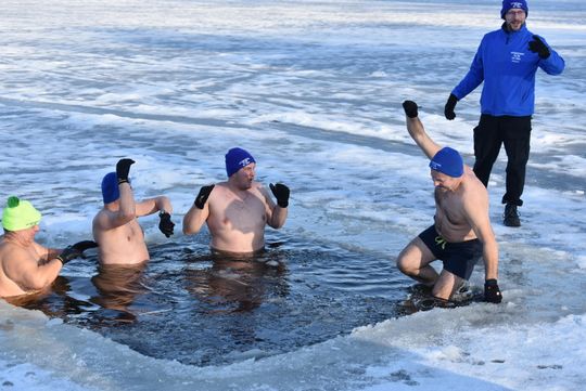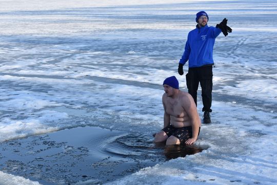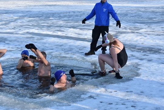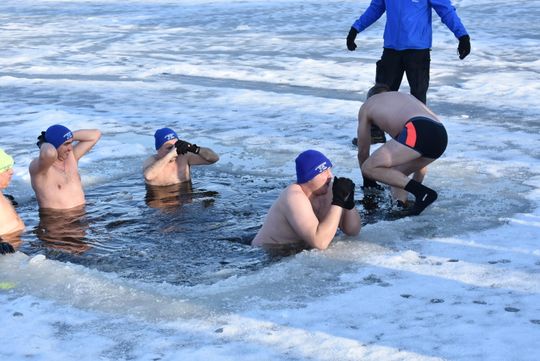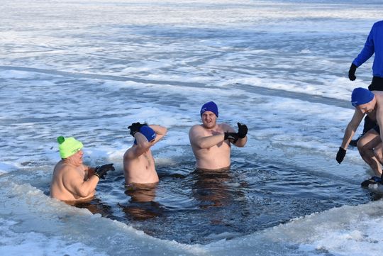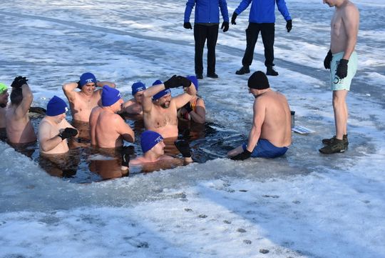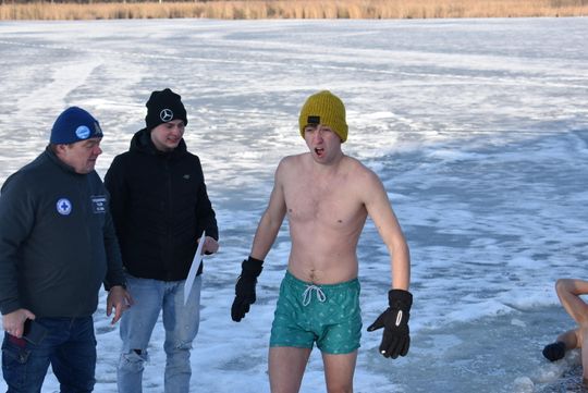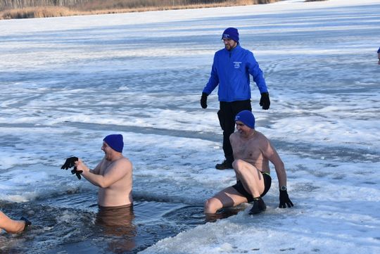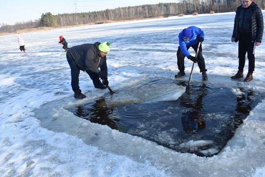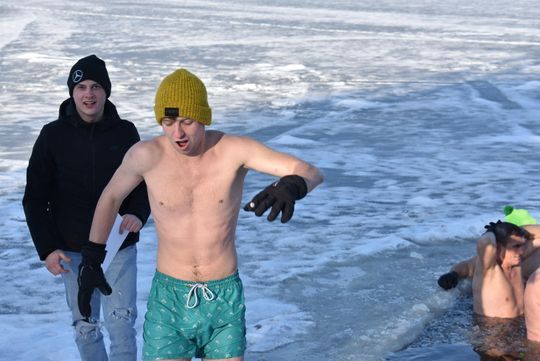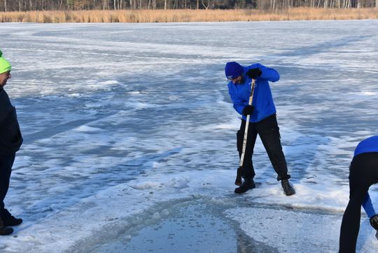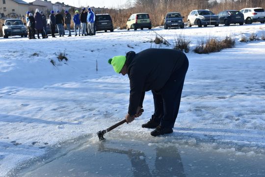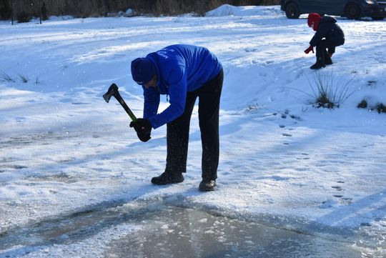 Zanim można było wejść do wody trzeba należało wyrąbać przerębel. W te niedzielę było trzech debiutantów. Oni przebywali w lodowatej wodzie niecałą minutę. Zaprawieni od lat w morsowaniu nawet pięć minut.