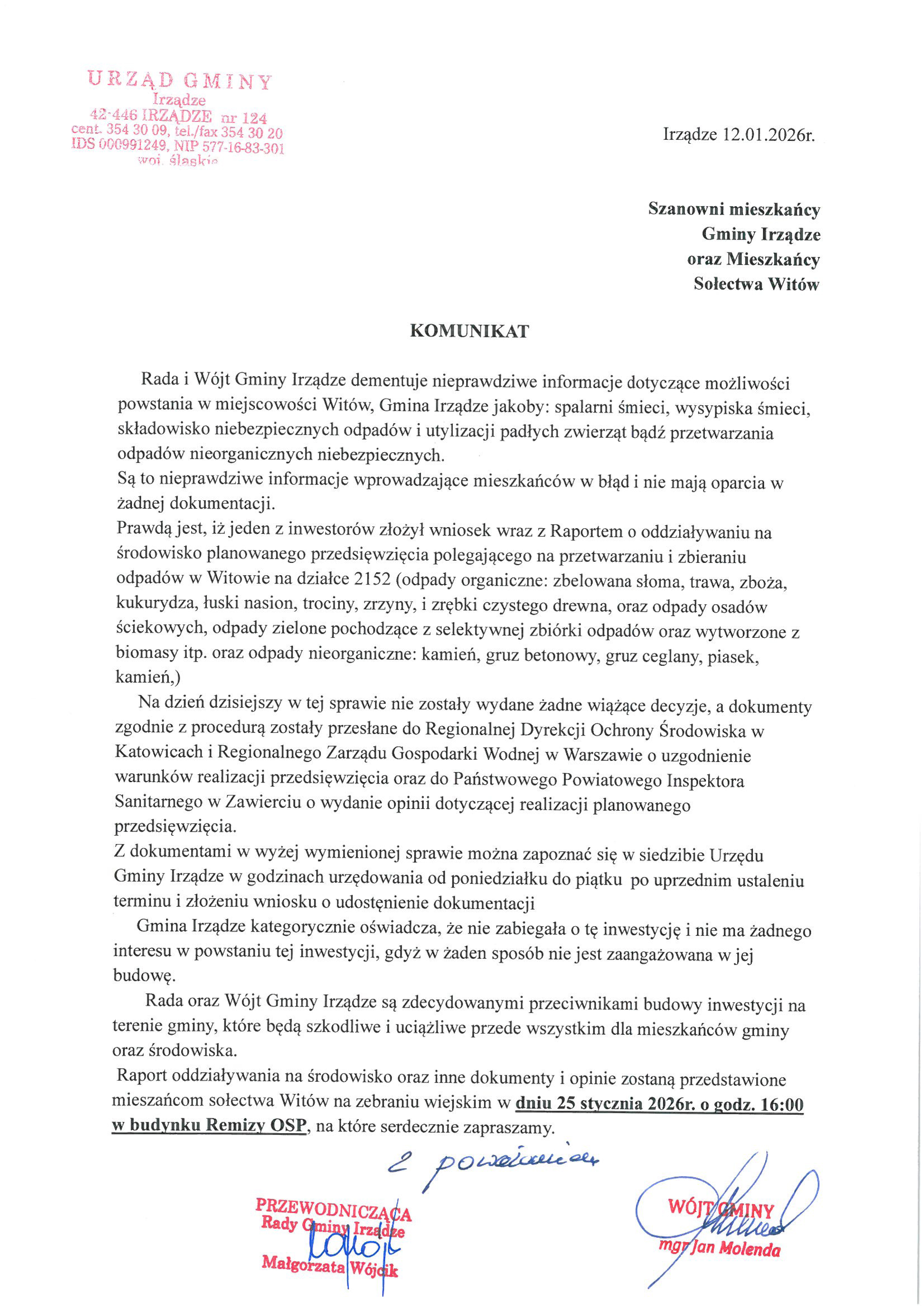 KOMUNIKAT z 12 stycznia 2026: "Rada i Wójt Gminy Irządze dementuje nieprawdziwe informacje dotyczące możliwości powstania w miejscowości Witów, Gmina Irządze jakoby: spalarni śmieci, wysypiska śmieci, składowisko niebezpiecznych odpadów i utylizacji padłych zwierząt bądź przetwarzania odpadów nieorganicznych niebezpiecznych.