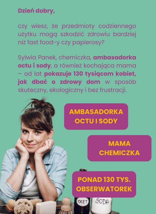 Sylwia Panek – przez swoich czytelników (na Instagramie @wzdrowymdomu to 130 tysięcy obserwujących) została okrzyknięta ambasadorka octu i sody ? Z wykształcenia jest chemiczką. Mama dwójki dzieci. Pomaga tworzyć zdrowe domy. Jest autorką kilku e-booków (np. „Etykietopedia” czy „Zdrowy dom bez plastiku”).