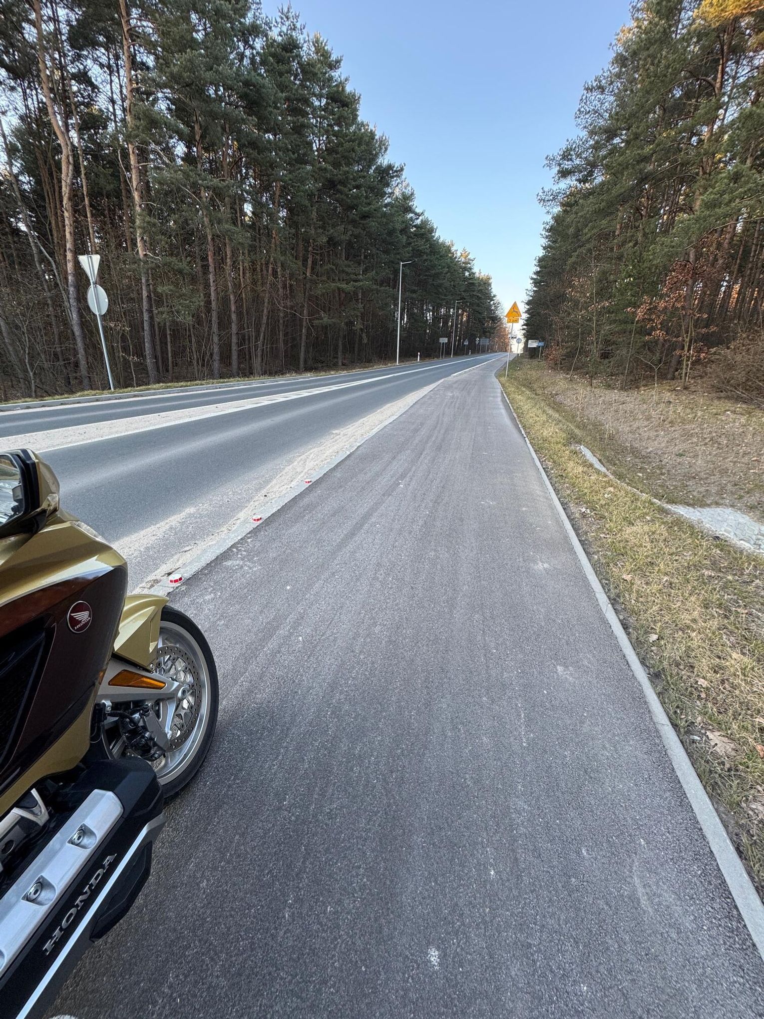 Jak widać jest lepiej, ale trzeba uważać na rondach i zapiaszczonych (ciągle!) przejściach dla pieszych. Kontrola (naprawdę posprzątali?) na redakcyjnym motocyklu Honda Gold Wing Tour rocznik 2025 wersja Anniversary na 50 lecie modelu.