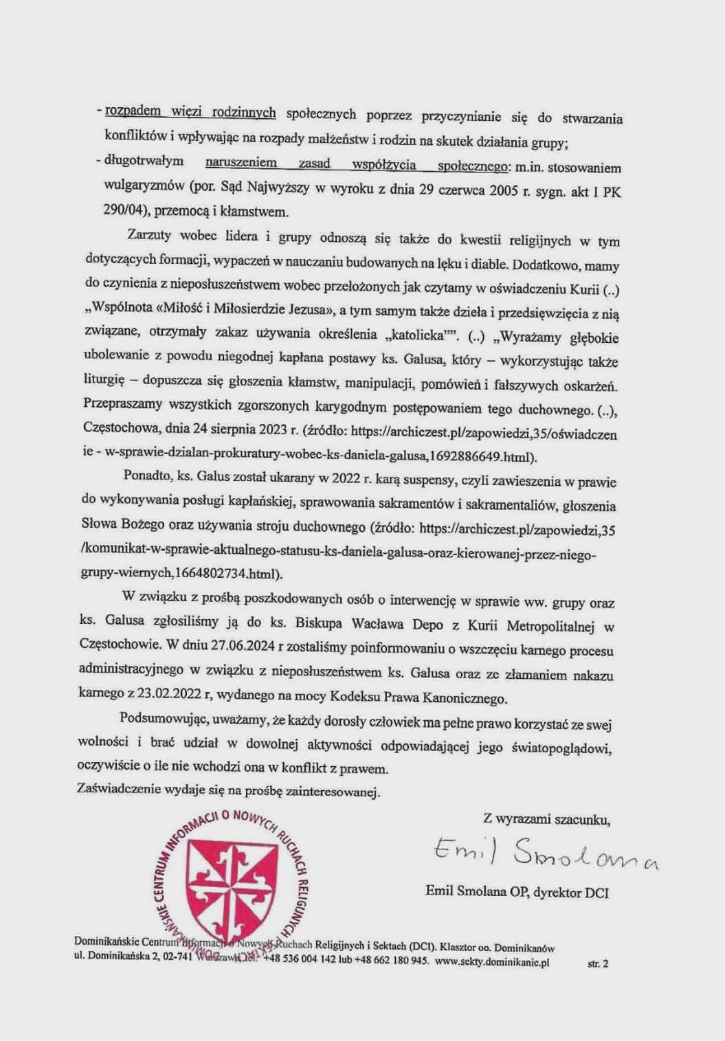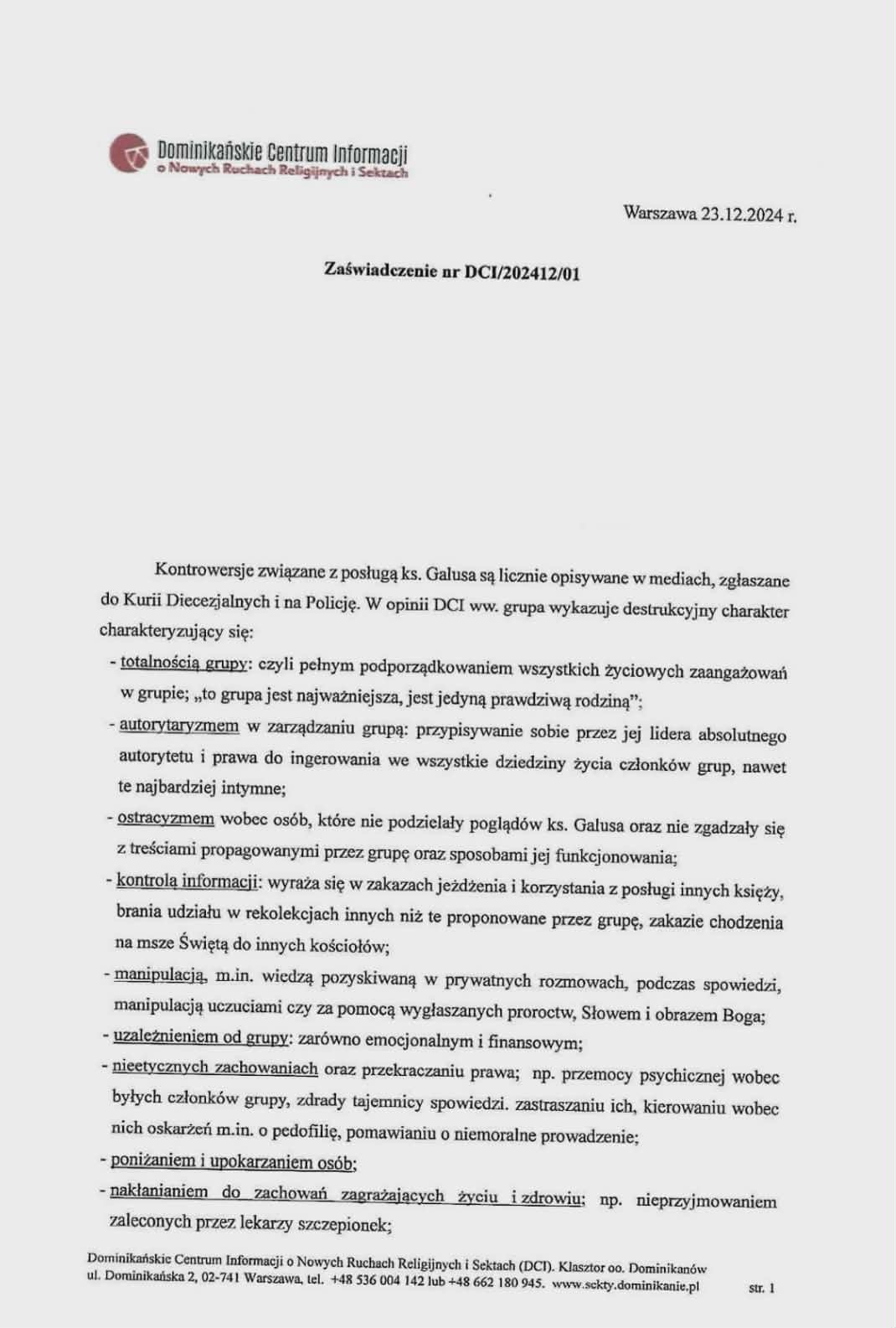 Świadek złożyła w tym momencie do akt Zaświadczenie wystawione przez Dominikańskie Centrum Informacji o o Nowych Ruchach Religijnych i Sektach. Zdobyliśmy ten dokument. Nosi on datę 23.12.2024 i zaczyna się od zdania: „Kontrowersje związane z posługą ks. Galusa są licznie opisywane w mediach, zgłaszane do Kurii Diecezjalnych i na Policję. W opinii DCI ww. grupa wykazuje destrukcyjny charakter”.