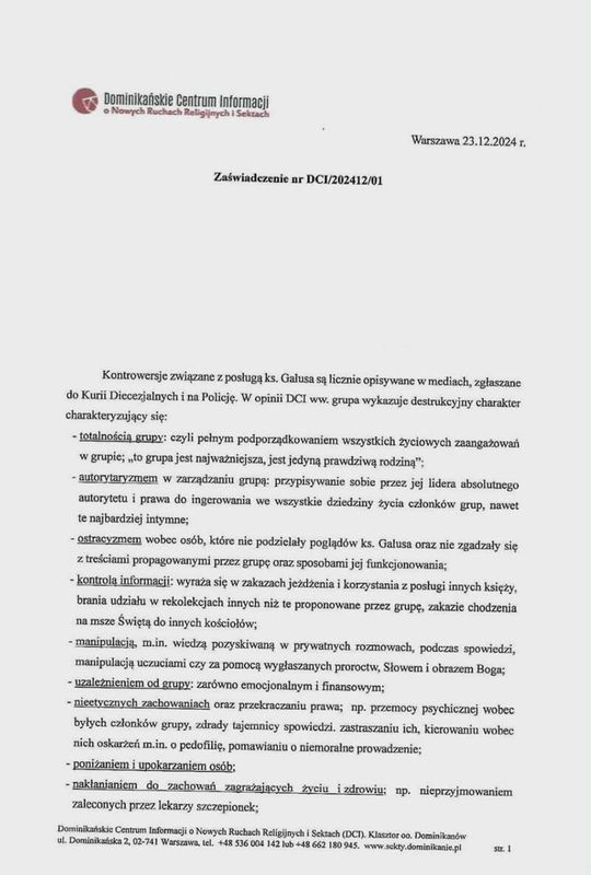 Świadek złożyła w tym momencie do akt Zaświadczenie wystawione przez Dominikańskie Centrum Informacji o o Nowych Ruchach Religijnych i Sektach. Zdobyliśmy ten dokument. Nosi on datę 23.12.2024 i zaczyna się od zdania: „Kontrowersje związane z posługą ks. Galusa są licznie opisywane w mediach, zgłaszane do Kurii Diecezjalnych i na Policję. W opinii DCI ww. grupa wykazuje destrukcyjny charakter”.