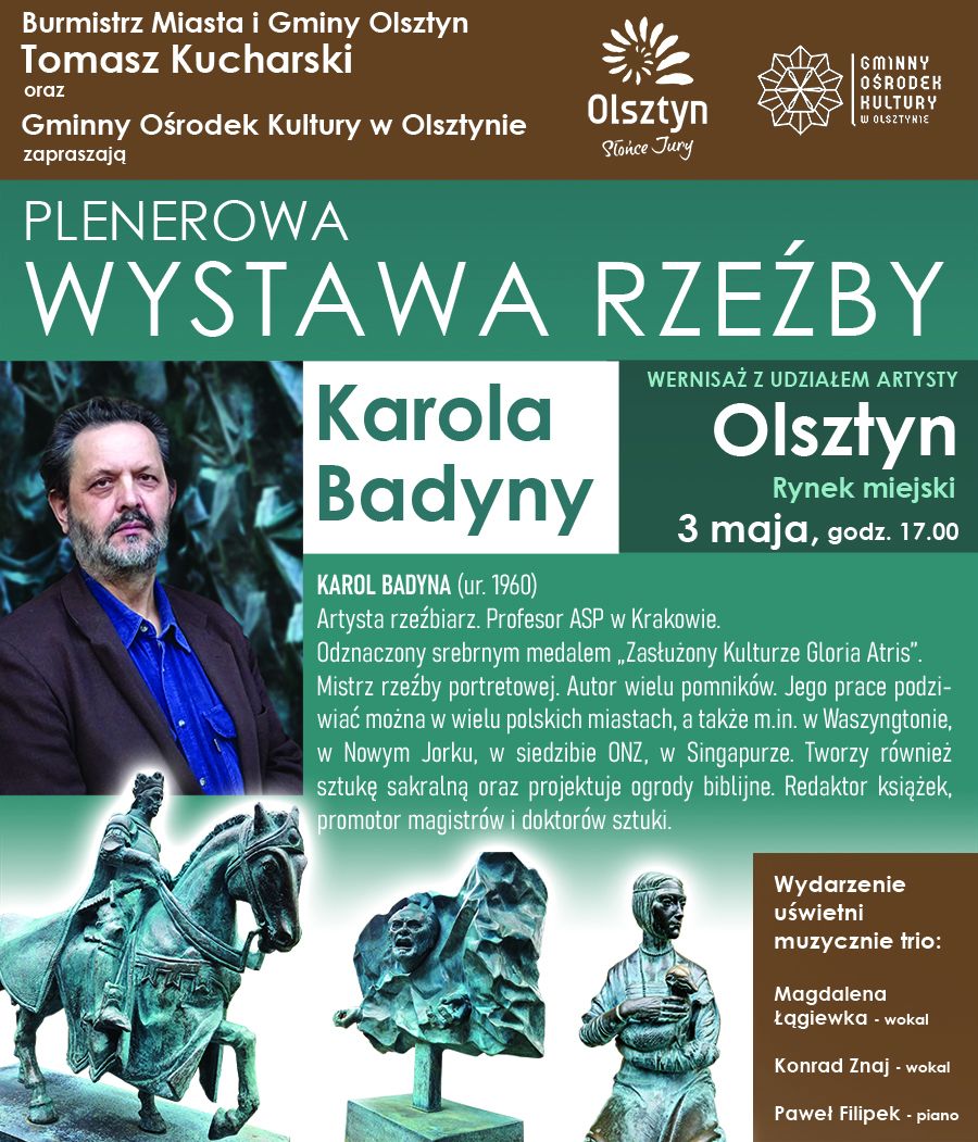 3 maja – o godzinie 17.00 odbędzie się wernisaż plenerowej wystawy rzeźb Karola Badyny z udziałem artysty. Wydarzenie uświetni muzyczne trio: Magdalena Łągiewka, Konrad Znaj i Paweł Filipek.