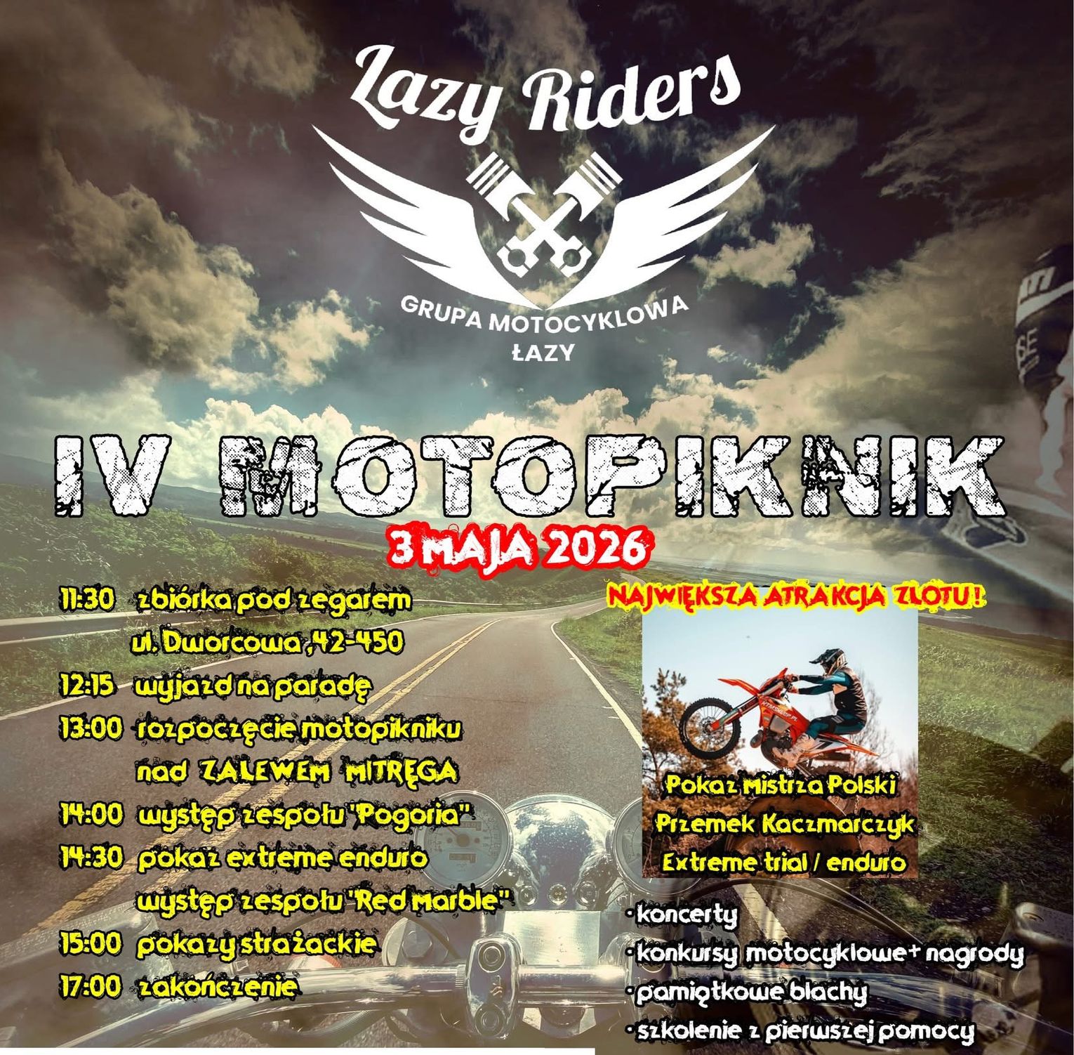 Sportowym wydarzeniem imprezy będzie występ Mistrza Polski w trial/enduro Przemka Kaczarczyka. Sportowiec o sobie pisał: "Nazywam się Przemek Kaczmarczyk i od najmłodszych lat jestem związany ze światem dwóch kół. Swoją przygodę z motosportem rozpocząłem od trialu motocyklowego. Przez wiele lat brałem udział w rywalizacji Mistrzostw Polski w Trialu, czego zwieńczeniem było zdobycie przeze mnie tytułu Mistrza Polski w roku 2008."