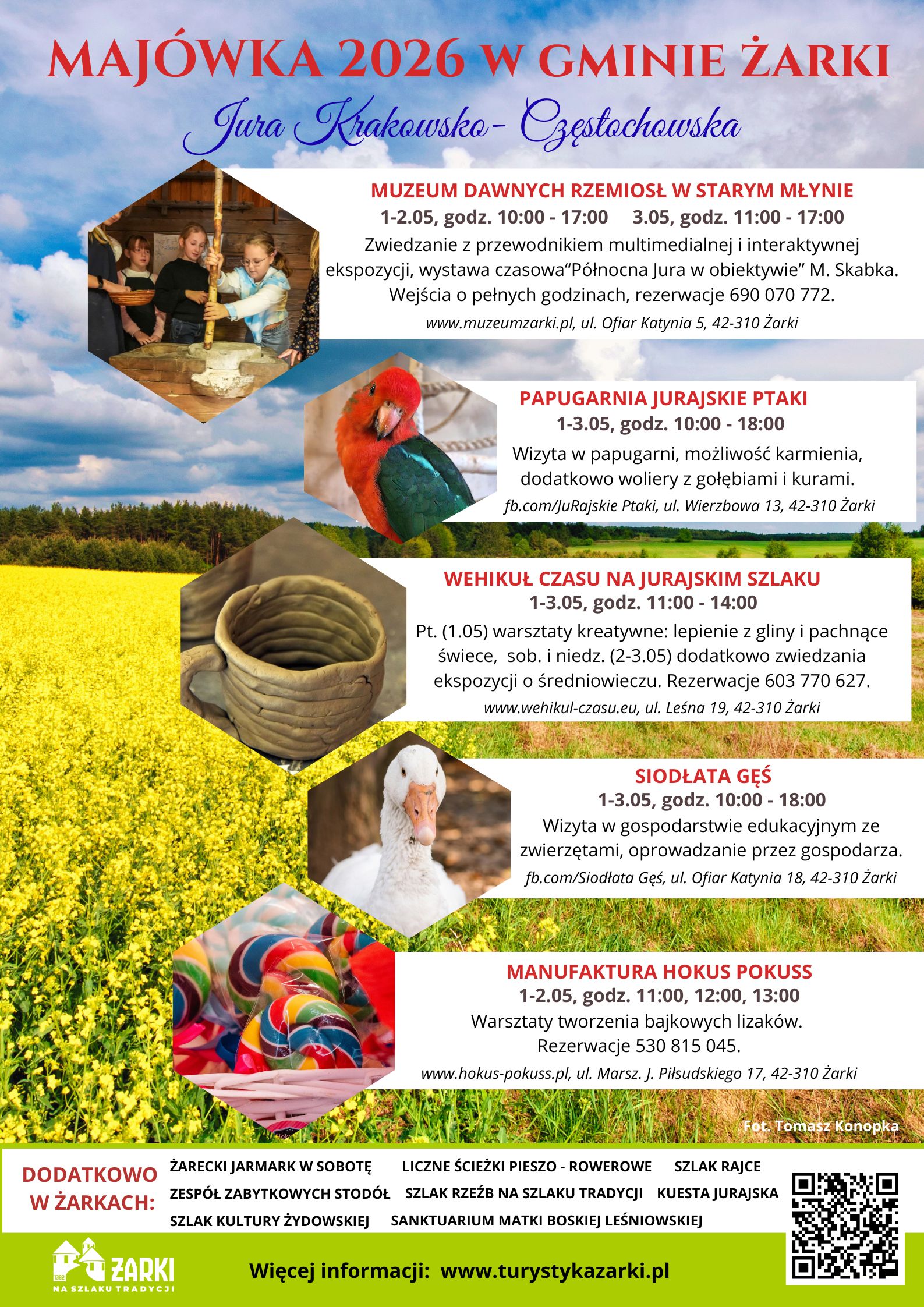Multimedialna i interaktywna ekspozycja prezentuje dawne tradycje rzemieślnicze, dodatkowo bezpłatna wystawa fotograficzna „Północna Jura w obiektywie” Marcina Skabka. Muzeum czynne: 1–2.05 godz. 10:00–17:00 oraz 3.05 godz. 11:00–17:00.